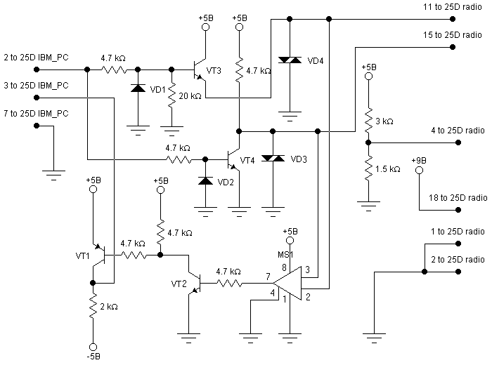 (разводка для разъёма IBM PC 25pin “D”). Справа по схеме контакты для